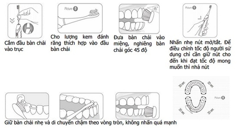 - Chải răng bằng bàn chải tự động cũng tương tự như bàn chải thường, chỉ khác ở điểm là đầu lông bàn chải tự động sẽ tự xoay và rung để làm sạch mặt răng, có thể đưa vào đánh tận các răng trong cùng mà ko cảm thấy vướng víu. Bạn hãy giữ chặt thân bàn chải trong lòng bàn tay, đưa đầu bàn chải vào miệng, chải lần lượt từng vùng 2-3 răng, di chuyển bàn chải để chải hết mặt ngoài, mặt trong và mặt nhai của tất cả các răng.