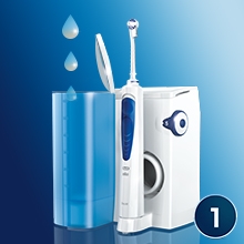 Sử dụng điều khiển xoay để chọn áp lực nước: Bước một cho áp suất nhẹ và mức năm cho áp suất mạnh. Oral-B khuyên bạn nên bắt đầu từ cấp độ một, đặc biệt khi bạn dễ bị chảy máu nướu hoặc khi trẻ em sử dụng dụng cụ rửa miệng.