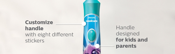 Miếng dán tay cầm thú vị cho phép trẻ em chọn giao diện của bàn chải đánh răng. Với tám thiết kế có thể hoán đổi cho nhau bên trong mỗi hộp bàn chải đánh răng, trẻ em có thể cho bàn chải của mình một diện mạo mới bao nhiêu lần tùy ý. Kết hợp với cơ hội tùy chỉnh giao diện của nhân vật ứng dụng của họ, trải nghiệm Philips Sonicare For Kids là tất cả về việc làm cho việc chăm sóc răng miệng hiệu quả trở nên hấp dẫn và vui vẻ mọi lúc.