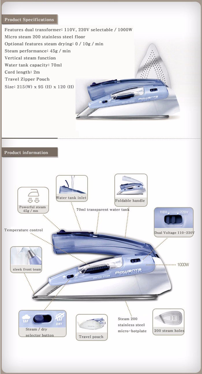 - Công suất điện áp kép cho phép bàn ủi hơi nước này được sử dụng trên phạm vi quốc tế, trong khi túi du lịch, thiết kế nhỏ gọn và tay cầm có thể gập lại cho phép tùy chọn đóng gói thuận tiện. Phân phối hơi nước đạt được thông qua công nghệ mặt đế Microsteam200 được cấp bằng sáng chế độc đáo, với đầu chính xác cho các khu vực khó tiếp cận. Bàn ủi hơi nước này mang đến sự kết hợp giữa hiệu quả và độ chính xác, cho kết quả ủi tốt ở bất cứ nơi nào bạn cần.