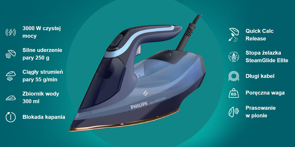 Đặc điểm nổi bật của Bàn là hơi nước Philips Azur Series 8000 DST8020/20, Công suất 3000W, Màu Xanh Dương