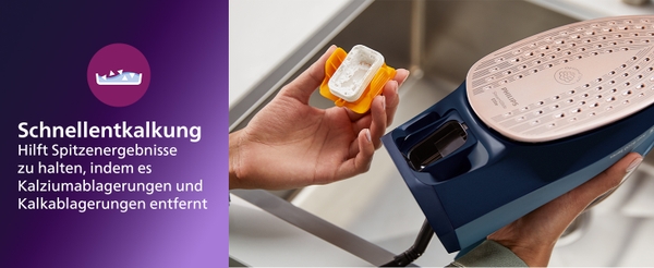 Chức năng tẩy cặn nhanh giúp làm sạch bàn ủi dễ dàng hơn và đảm bảo hiệu suất phun tia tốt trong thời gian dài.