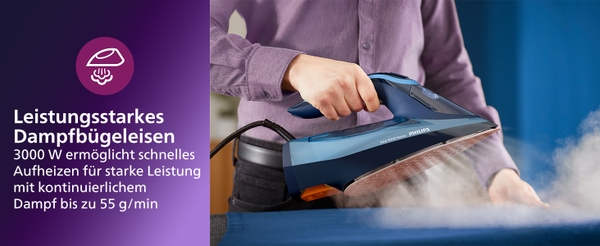 Hơi nước ra đều, mạnh tối đa 55g/phút mọi chuyển động ủi đều tác động lên quần áo, nhờ đó bạn có thể làm phẳng các nếp nhăn nhanh hơn.