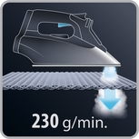 Lượng hơi nước liên tục 65 g/phút để loại bỏ nếp nhăn tuyệt vời và tăng cường hơi nước mạnh mẽ 230 g/phút để làm mờ hoàn toàn các nếp nhăn cứng đầu đặc biệt trên các loại vải khô và dày, với sự trợ giúp của xịt nếu cần thiết. 3100 Watts để tăng nhiệt nhanh.