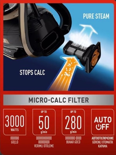 Lọc 100% hơi nước thoát ra ngoài và do đó ngăn ngừa các vết cặn vôi khó coi trên quần áo. Bộ lọc này giúp tăng tuổi thọ của sản phẩm và giảm thiểu tình trạng tắc nghẽn trong đầu phun.