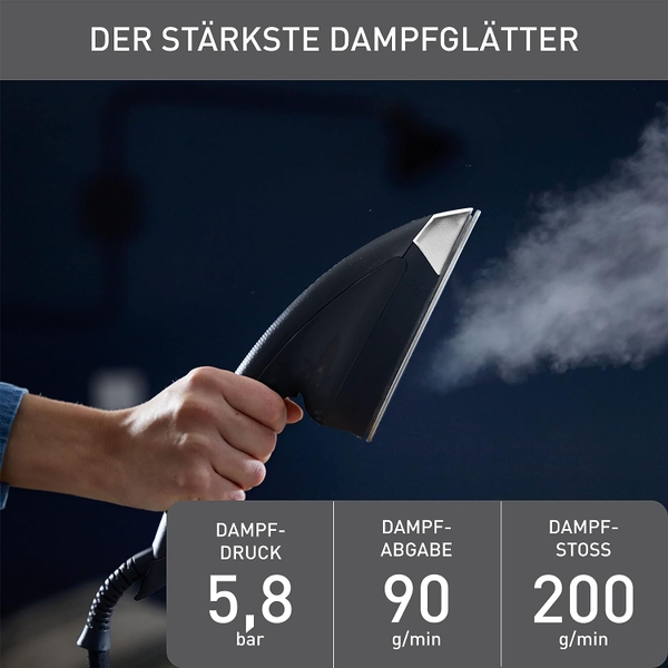 Công nghệ áp suất cao cải tiến mang đến kết quả hoàn hảo nhờ sức mạnh hơi nước vượt trội: Áp suất hơi nước lên đến 5,8 bar, lượng hơi nước ra liên tục lên đến 90 g/phút và tăng cường hơi nước cực mạnh lên đến 200 g/phút.