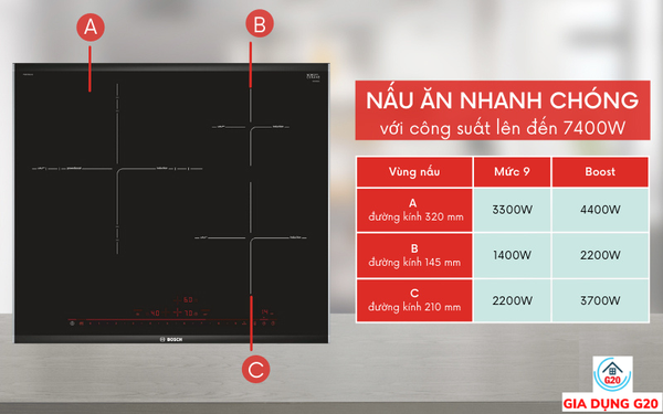Với 3 vùng cảm ứng nấu với tổng công suất lên đến 7400W, người dùng có thể chế biến món ăn một cách nhanh chóng.