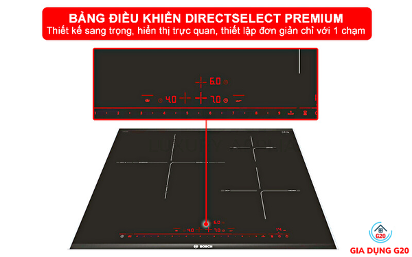 Bảng điều khiển cảm ứng DirectSelect Premium được nâng cấp từ phiên bản DirectSelect, có chiều rộng 30 cm, giúp người dùng dễ dàng chọn vùng nấu. Đặc biệt, bảng điều khiển được thiết kế hiển thị đèn LED, nằm ẩn dưới mặt kính. Khi bật công tác thì mặt kính sẽ hiển thị các tùy chọn trên bảng điều khiển, còn khi tắt thì bảng điều khiển sẽ biến mất. Thiết kế này cũng giúp người dùng có thể dễ dàng lau dọn mặt bếp mà không làm mở các nút tùy chọn.