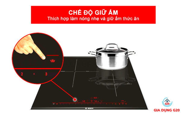 Bếp từ Bosch serie 8 PID675DC1E cung cấp tính năng giữ ấm tiện lợi, giúp người dùng giữ ấm thức ăn trong trường hợp bạn đã chế biến xong thức ăn nhưng chưa muốn thưởng thức ngay.