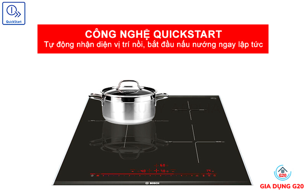 Tính năng QuickStart của bếp từ Bosch PID675DC1E phát hiện nhanh chóng vị trí người dùng đặt nồi và tự động hiển thị bảng điều khiển tại vùng nấu đó. Người dùng có thể bắt đầu nấu ngay và chọn chế độ nấu mong muốn mà không cần phải chờ đợi.