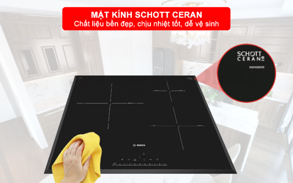 - Mặt kính bếp: SCHOTT CERAN sản xuất tại Mainz – Đức