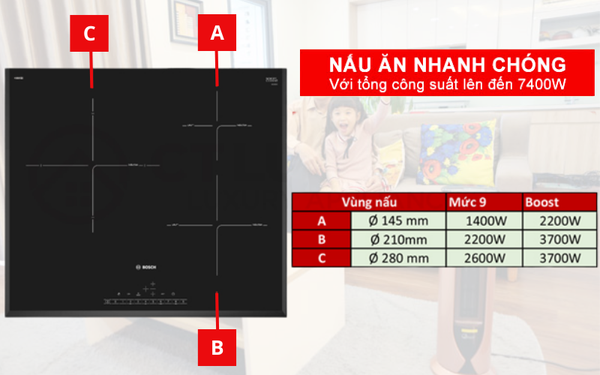 3 vùng nấu cảm ứng với Sprint chức năng cho từng khu vực