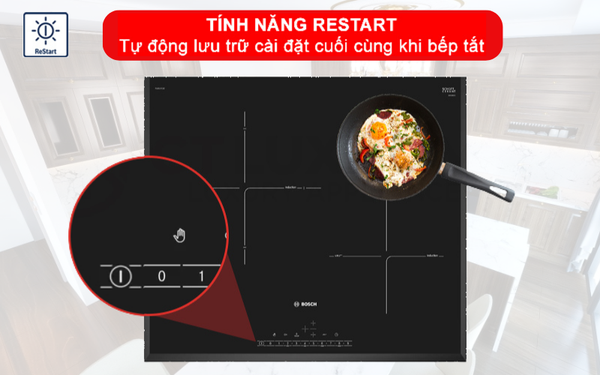 - Bếp sẽ ghi nhớ mức công suất đang nấu và các tính năng cài đặt trên bếp nếu bếp vô tình bị tắt thì khi bật lại, bếp hoạt động trở lại với cài đặt trước đó.