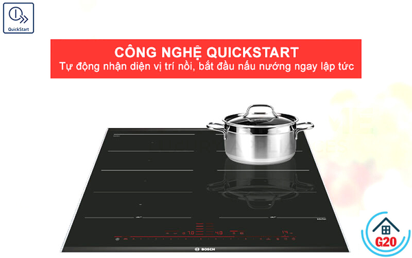 Với chức năng nhận diện vị trí nồi nhanh chóng được trang bị trên bếp từ Bosch. Khi bật bếp, QuickStart sẽ giúp bạn nhận diện và truyền nhiệt tự động các nồi, chảo với kích thước khác nhau bạn đặt trên bếp. Giúp bạn tiết kiệm tối đa thời gian so với khi chọn từng chương trình và công suất cho mỗi dụng cụ nấu khác nhau.