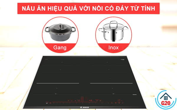 Đối với bếp từ Bosch PXX675DC1E, cần phải lựa chọn nồi nấu thích hợp khi bếp chỉ có thể dùng các nối chảo có đáy từ tính. Chất liệu nồi, chảo có thể dùng như thép không gỉ, gang, inox,...thì bếp mới có thể tiếp nhận để truyền nhiệt và nấu chín thực phẩm. Nhưng chúng tôi khuyên bạn nên sử dụng các loại chảo có đáy từ, đây là các loại chảo được thiết kế tối ưu khi sử dụng trên bếp từ. Các loại chào có đáy từ có thể truyền nhiệt được đẩy lên nhanh chóng khi sử dụng với bếp từ.