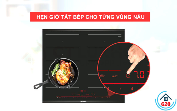 Bếp từ PXX675DC1E được trang bị thêm tính năng hẹn giờ đối với từng vùng nấu. Việc này giúp bạn quản lý các món ăn một cách hoàn hảo, vùng nấu sẽ tự động kết thúc khi hết thời gian.
