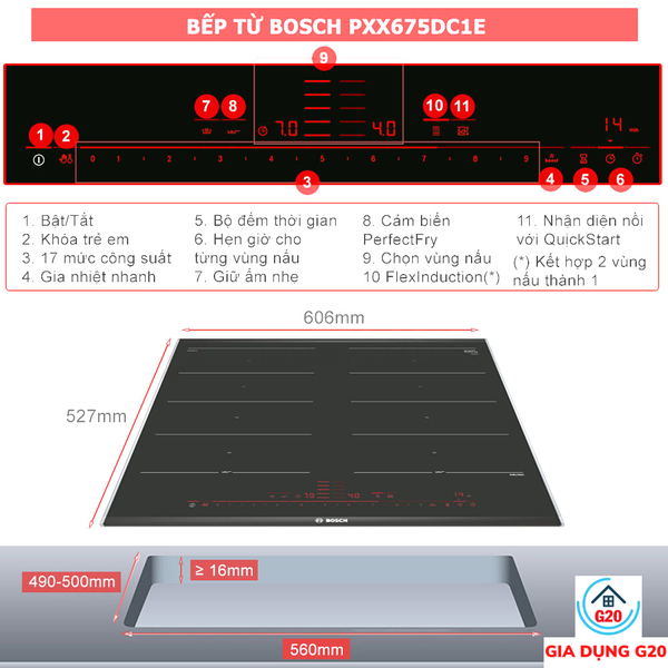Thông số kỹ thuật của BẾP TỪ BOSCH SERIE 8 PXX675DC1E Đa điểm Không Giới Hạn Vùng Nấu