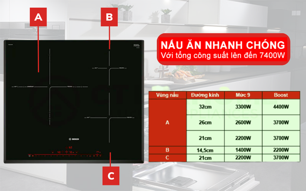 Bếp từ Bosch PID651DC5E có 3 vùng nấu riêng biệt cho các kích thước và các mức công suất sau đây: