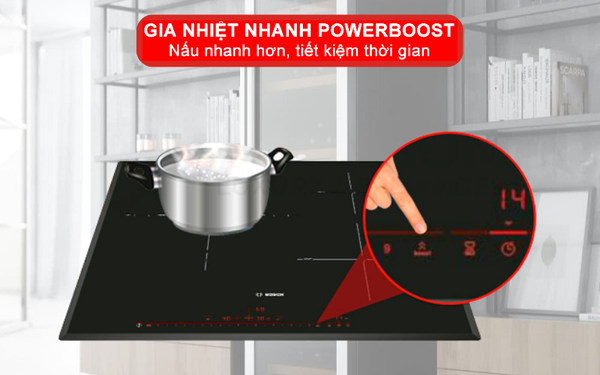 Khi thời gian là vấn đề thiết yếu, bạn cần dọn đồ ăn ra nhanh hơn thì chức năng PowerBoost trên bếp từ Bosch sẽ giúp bạn. Khi kích hoạt, bếp sẽ nâng mức nhiệt tại vùng nấu lên cao nhất bổ sung thêm 50% mức công suất, giúp bạn tối ưu thời gian hiệu quả và nhanh chóng tiết kiệm lên đến 35% thời gian. Nhưng chúng tôi khuyên bạn nên hạn chế khi sử dụng chức năng này vì khi đẩy mức nhiệt lên cao nhất thì đồng thời lượng điện năng tiêu thụ cũng rất cao, điều này lâu dần sẽ rất ảnh hưởng đến tuổi thọ của bếp trong lâu dài.