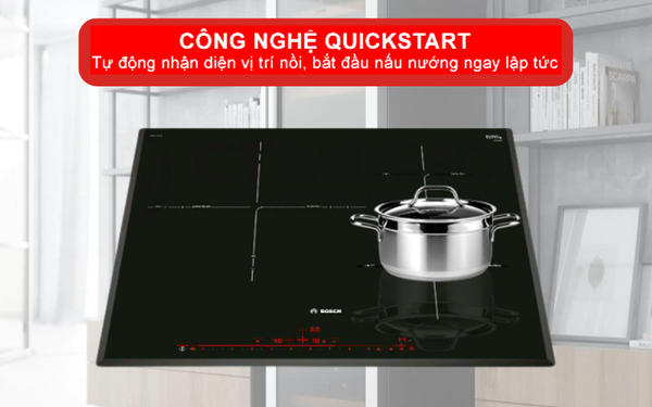 Bếp từ Bosch PID651DC5E với công nghệ QuickStart, cảm ứng nhận diện nồi tự động nhanh chóng để bắt đầu nấu nướng. Khi kích hoạt, bếp sẽ tự động nhận diện nồi tùy thuộc vào kích thước và truyền nhiệt nhanh chóng. QuickStart giúp bạn tối ưu thời gian hơn so với việc bạn phải thiết lập vùng nấu và công suất.