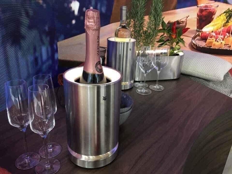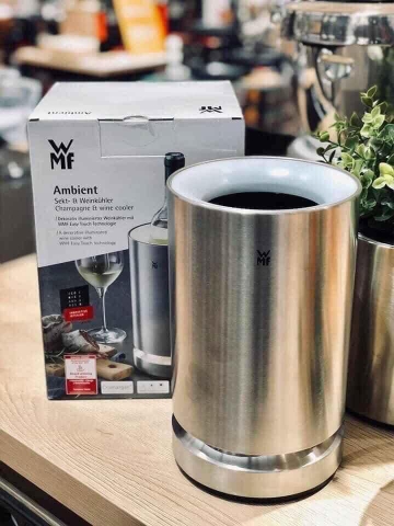 + Để xuất hiện tươi sáng và để trang trí hiệu quả: rượu vang sáng và làm mát chai rượu sâm banh cho chai lên đến đường kính 92 mm. Hai vòng sáng ở mỗi đỉnh và đáy của bộ tản nhiệt cung cấp ánh sáng trong khí quyển, được điều khiển bằng cách chạm vào vỏ được làm bằng Cromargan (công nghệ WMF Easy Touch).