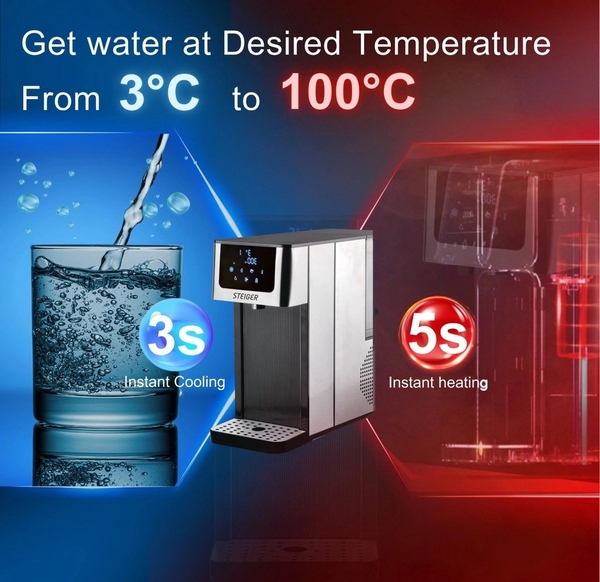 Bình thủy điện Steiger STG 888 trang bị 2 chức năng làm lạnh và đun nóng trong cùng 1 thiết bị, có thể làm lạnh nước đến 5°C và đun sôi nước đến 100°C. Công suất lớn đến 2600W giúp đun sôi nước nhanh chóng. Chỉ mất khoảng 5 giây để có nước nóng và 3 giây để có nước mát lạnh sử dụng tức thì.