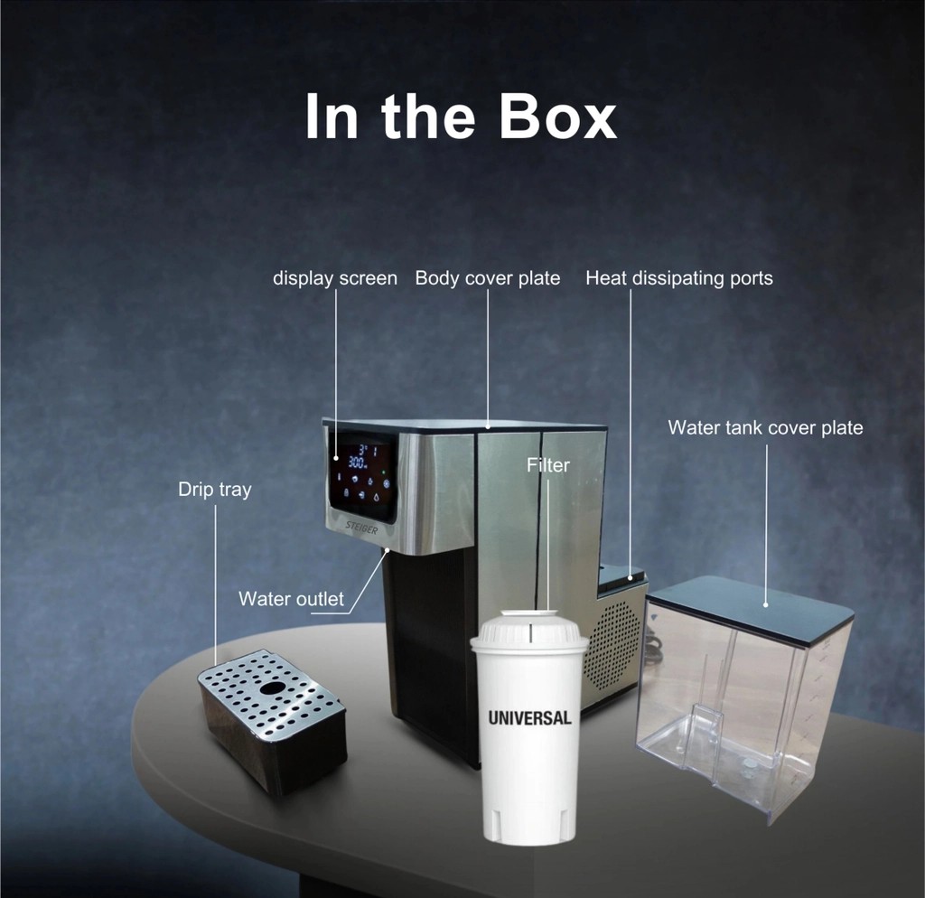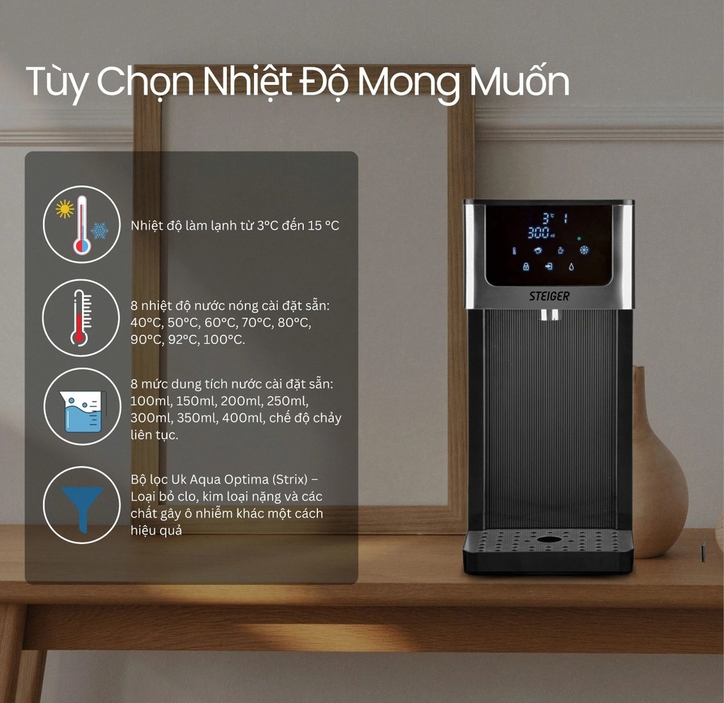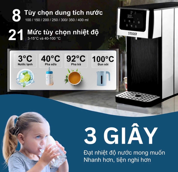 Với bình thuỷ điện nóng lạnh Steiger STG 888, bạn có thể tuỳ chọn chính xác mức nhiệt độ và dung tích nước theo nhu cầu, với 10 mức nhiệt độ:5°C – nhiệt độ phòng – 40°C – 50°C – 60°C – 70°C – 80°C – 90°C – 92°C – 100°C Và 8 mức dung tích nước: 100ml – 150ml – 200ml – 250ml – 300ml – 350ml – 400 – 500ml đáp ứng phục vụ cho các nhu cầu trong cuộc sống như: pha sữa, pha trà, pha cà phê, pha sữa, nấu mì, …