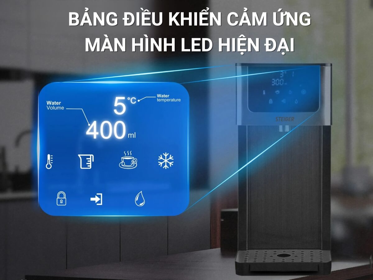 Bình thủy điện Steiger STG 888 thiết kế hệ thống bảng điều khiển cảm ứng và màn hình LED hiện đại, dễ dàng sử dụng. Các chức năng được thể hiện rõ ràng, dễ quan sát, phù hợp với mọi người dùng, chỉ cần thao tác chạm nhẹ để tuỳ chọn mức nhiệt độ và mức nước theo ý muốn.