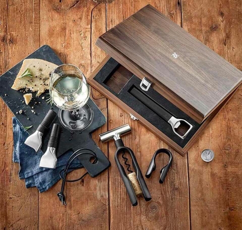 Những người pha rượu chuyên nghiệp và những người sành rượu bình thường đều biết cách tận hưởng những gì tốt đẹp nhất trong cuộc sống. Và để thưởng thức ngay cả loại rượu bình thường nhất cũng phải tuân theo một nghi lễ nhất định, theo đó WMF đã tạo ra bộ 5 món Baric. Bộ dụng cụ mở rượu vang WMF hoàn chỉnh với các phụ kiện chuyên nghiệp dành cho những người yêu thích rượu vang và trong một hộp gỗ óc chó có khóa, trang nhã và sang trọng.