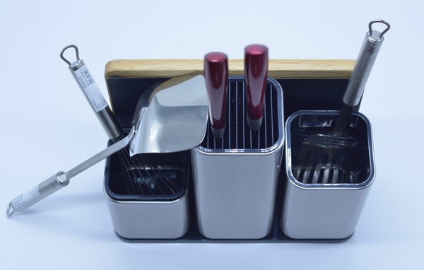 • Set đựng dụng cụ kèm thớt này được thiết kế rất thông minh, gọn gàng, đế cao su chống trượt rất hợp lý để trên mặt bếp.