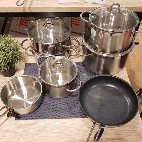 - Chất liệu thép không gỉ 18/10 của bộ nồi từ Silit Diamant 7 (Inox 18/10) - inox cao cấp chuyên dùng để sản xuất các dụng cụ nấu ăn với đặc tính không bị oxy hoá, chịu được nhiệt độ cao, khả năng chống trầy xước và móp méo do va đập, bề mặt sáng bóng, độ bền cao, dễ chùi rửa, giữ cho sản phẩm luôn đẹp như mới, có thể sử dụng lâu dài và đặc biệt là tuyệt đối an toàn cho sức khỏe.