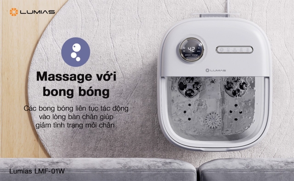Bồn massage chân Lumias LMF-01W mang đến trải nghiệm thư giãn hoàn toàn mới với công nghệ massage bằng bong bóng độc đáo. Hàng ngàn bong bóng li ti sẽ nhẹ nhàng tác động vào lòng bàn chân, xoa dịu các cơ bắp căng cứng, giảm tình trạng mỏi chân hiệu quả. Cảm giác như đang được ngâm chân trong một spa cao cấp ngay tại nhà.