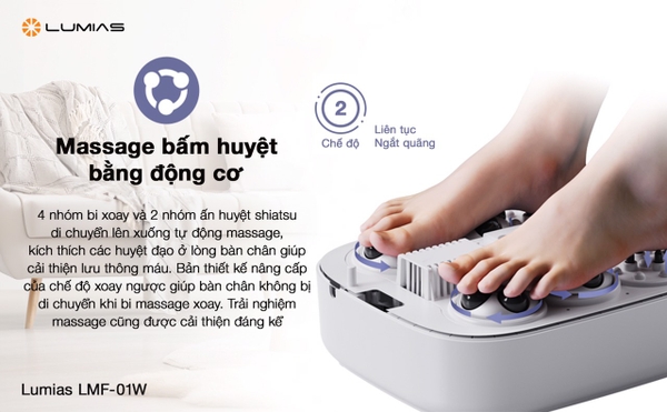 Bồn massage chân Lumias LMF-01W mang đến trải nghiệm thư giãn tuyệt vời ngay tại nhà. Với công nghệ massage bấm huyệt bằng động cơ tiên tiến, 4 nhóm bi xoay kết hợp 2 nhóm ấn huyệt shiatsu di chuyển lên xuống tự động, kích thích sâu các huyệt đạo ở lòng bàn chân, cải thiện lưu thông máu hiệu quả. Thiết kế thông minh với chế độ xoay ngược giúp cố định bàn chân, mang đến cảm giác thoải mái và thư giãn tối đa. Bạn có thể lựa chọn chế độ massage liên tục hoặc ngắt quãng để phù hợp với nhu cầu của mình.