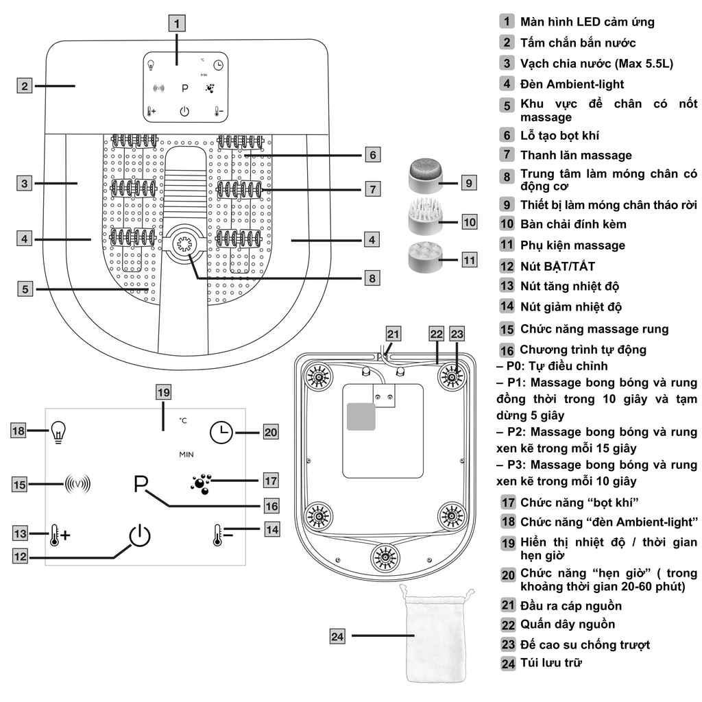 • Các đầu massage tùy chọn: Lắp đầu massage cần dùng vào giá đỡ ở giữa bồn, dùng chân ấn nhẹ để kích hoạt motor điện.