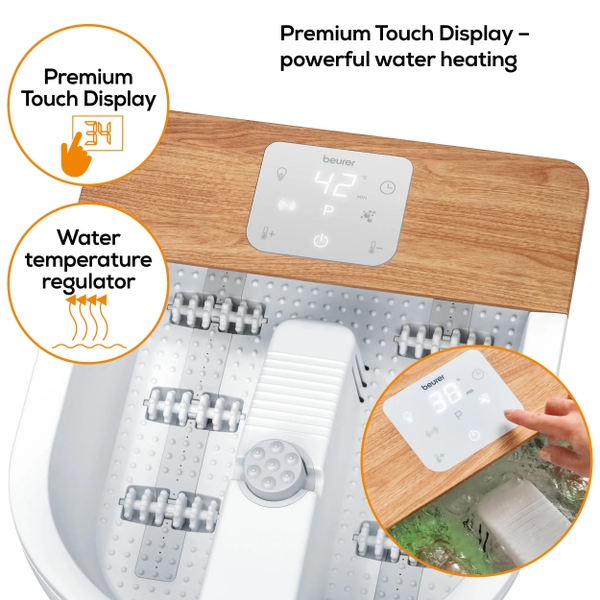 Tấm chắn nước bằng gỗ giản dị nhưng không kém phần sang trọng kết hợp với màn hình LED của Bồn Ngâm Chân Beurer FB 65 foot spa hiển thị rõ ràng các chức năng của máy. Vách ngăn 2 lớp của bồn giúp cách nhiệt tốt hơn.