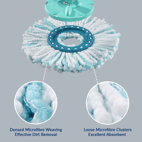 Đầu lau bao gồm 2 phần: cụm vi sợi dày đặc với lông cứng hơn giúp bám chặt các hạt bụi bẩn lớn hơn và cụm vi sợi lỏng hơn với các chùm mịn hơn được thiết kế để hút chất bẩn bám vào các hạt nước hiệu quả hơn.