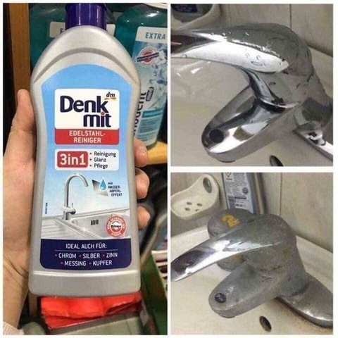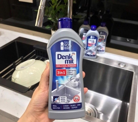 Chai tẩy rửa inox Denkmit Edelstahlreiniger 300ML giúp làm sạch sẽ, đánh bóng và ngăn chặn đóng cặn trở lại trên các thiết bị gia dụng làm bằng kim loại như chậu rửa bát, các vòi nước, lư hương, trang sức bằng kim loại bạc lâu ngày bị đen…