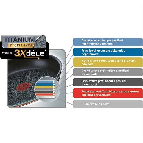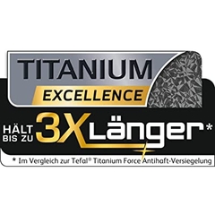- Lớp phủ chống dính Tefal Titanium Excellence có khả năng chống chịu cao, chịu được sự hao mòn cao nhất và rất lý tưởng để sử dụng với các dụng cụ nhà bếp bằng kim loại.