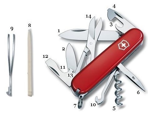 Dụng Cụ Đa Năng Victorinox Climber, được trang bị tới 14 công dụng khác nhau, đa năng. Giúp bạn tiết kiệm được chi phí, tốn kém khi phải săm thêm đồ nghề, đa tính năng phù hợp với từng công việc cụ thể. Sau đây là 14 tính năng của sản phẩm Victorinox Climber:
