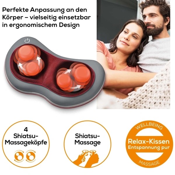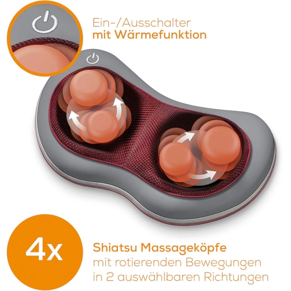 - Các đầu mát xa xoay của gối mát xa Shiatsu Beurer mô phỏng theo chuyển động áp lực nhào nắn của mát xa Shiatsu. Gối mát xa Beurer kiểu Shiatsu này đem lại cho bạn và những người dùng khác trải nghiệm mát xa nhẹ nhàng và hiệu quả.