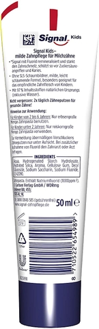 Kem đánh răng Signal dành cho trẻ em đến 6 tuổi với hương trái cây, Kem đánh răng Signal dành cho trẻ em với 97% thành phần có nguồn gốc tự nhiên (bao gồm cả nước), Kem đánh răng Signal có fluor tái cấu trúc và củng cố men răng - cách này giúp bảo vệ răng sữa của trẻ khỏi sự tấn công của axit đường và sâu răng, kem đánh răng với công thức dịu nhẹ dành cho răng sữa, kem đánh răng không chứa chất tạo bọt SLS, công thức tạo bọt nhẹ, đặc biệt thích hợp cho nướu nhạy cảm của trẻ.