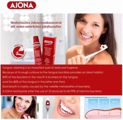 Ajona là một loại kem đánh răng y tế có độ cô đặc, giầu khoáng chất gấp năm lần kem đánh răng bình thường nên mỗi lần sử dụng bạn chỉ cần lấy bằng một hạt đậu (điều này cũng rất thuận tiện khi bạn dùng bàn chải máy).