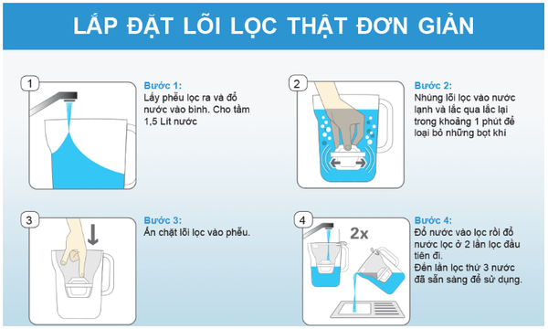 - Nhúng lõi lọc vào nước và lắc nhẹ để giảm bọt khí.