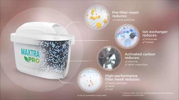 - Bộ lọc nước Brita Maxtra Pro All In 1 ứng dụng công nghệ MicroFlow, sẽ loại bỏ hoàn toàn các tạp chất có hại trong nước như clo, vôi, chì và đồng. Điều tuyệt vời với Bộ lọc nước Brita Maxtra Pro All In 1 không chỉ ở công năng lọc hoàn hảo mà nó còn cải thiện đáng kể hương vị của nước, khử được mùi tanh cho nước sau lọc thơm hơn, kích thích vị giác và khứu giác. Vì thế, các bạn có thể dùng nước lọc bằng cách trực tiếp hoặc làm lạnh và đun nóng.