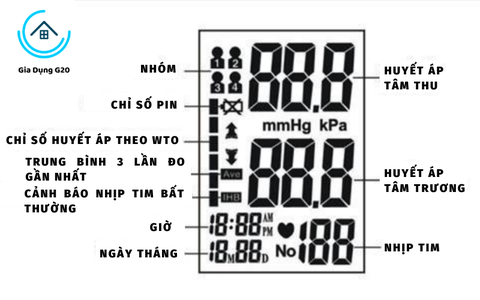 - Hiển thị: huyết áp tâm thu, huyết áp tâm trương, xung, ngày, giờ.