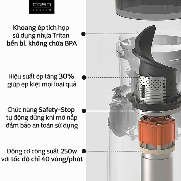 Máy ép chậm CASO SJW 600 được trang bị các tính năng an toàn như chức năng Safety-Stop - ngắt tự động khi người dùng mở nắp, giúp đảm bảo an toàn cho người sử dụng. Hai ca lớn dung tích 1 lít mỗi ca giúp bạn dễ dàng thu thập nước ép và bã sau quá trình ép. Động cơ AC 250 watt mạnh mẽ, giúp máy xay được hết tất cả các loại hoa quả. Từ những hoa quả cứng như củ dền đến các loại rau như rau cần, rau má đều có thể ép lấy nước dễ dàng. Hoạt động yên tĩnh giúp máy hoạt động ổn định và hiệu quả. Chân chống trượt đảm bảo rằng máy đứng vững và an toàn trong suốt quá trình sử dụng.