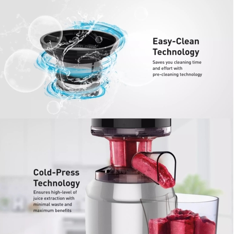 Công nghệ ép lạnh: Đảm bảo chiết xuất nước trái cây ở mức độ cao với chất thải tối thiểu và mang lại lợi ích tối đa. Thưởng thức hương vị tự nhiên, màu sắc tinh khiết và tất cả các chất dinh dưỡng của trái cây, rau và lá xanh yêu thích của bạn.