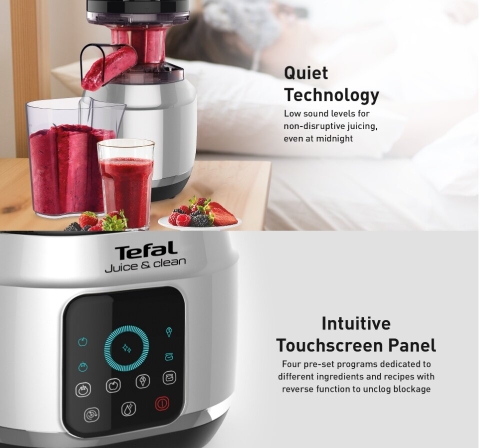 Máy ép chậm điều khiển chức năng thông qua màn hình cảm ứng hiện đại dễ sử dụng. Máy ép trái cây Tefal được áp dụng công nghệ ép lạnh đảm bảo chiết xuất tối đa nước rau quả và giữ nguyên hương vị, màu sắc và chất dinh dưỡng tự nhiên trong hoa quả, rau củ.