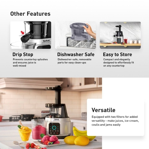 Máy ép chậm Tefal ZC420 với khả năng giữ lại gần như nguyên vẹn chất dinh dưỡng có trong rau củ, dễ dàng vệ sinh và bảo quản, đặc biệt là thoải mái sáng tạo những công thức nước ép của riêng bạn, đây chắc chắn là lựa chọn máy ép hoàn hảo cho gia đình.