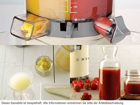 Thiết kế của Máy ép trái cây Smeg Slow Juicer giúp sử dụng ngay: rau củ quả, cắt thành từng miếng, có thể đặt thẳng đứng, không bỏ vỏ, mật độ dinh dưỡng cao. Số lượng được kiểm soát dễ dàng. Nước trái cây tạo ra được thu trực tiếp trong một carafe, trong khi bã được dẫn đến một cửa hàng khác dành riêng cho mục đích này. Nếu máy hút mùi bị tắc, chức năng "Reverse" cho phép bạn vặn ngược chiều kim đồng hồ để mở khóa cặn thực phẩm. Máy vắt nước trái cây mang lại hiệu suất mạnh mẽ trong khi tiêu thụ điện năng thấp.